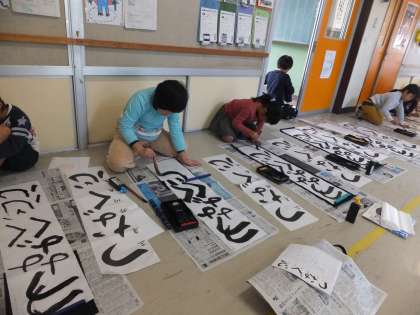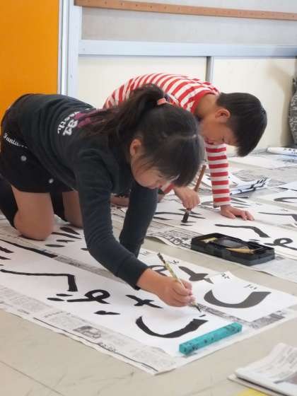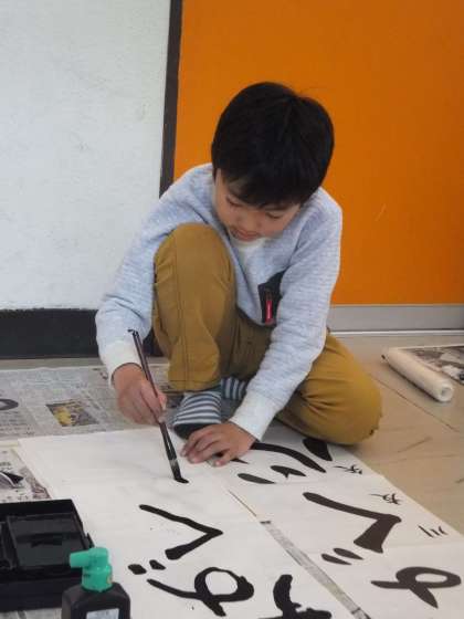 半紙の長さや筆の太さにとまどいながら、集中して「つながる心」の練習をしていました。