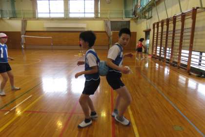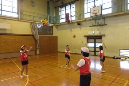 バレーボールの学習です。楽しくウォーミングアップをして、チームごとで練習をします。