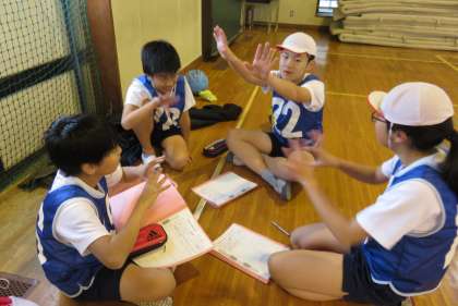 チームで練習をしたり、話し合いをしたりして、課題を解決していきます。それぞれ作戦を立てていました。