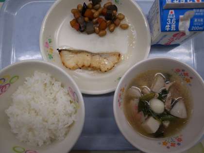 ご飯 牛乳 鱈の味噌焼き 五目大豆 白玉雑煮