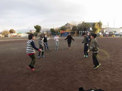 6年生と校長先生が、「二重跳び」と「後二重跳び」、「ハヤブサ」で勝負します。