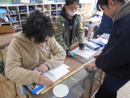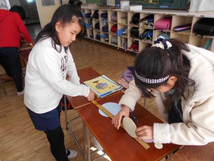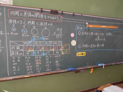 今日の少人数算数では、直径と円周の関係を考えました。厚紙の円をものさしの上でころがして円周を求めました。「滑っちゃうからソフト下敷きを置こう。」「だいたい直径の3倍くらいになってるよ。」「違う大きさの円でも同じだったよ。」友達とペアで確かめながら規則性を見つけていきました。明日は円周率という言葉を学習します。