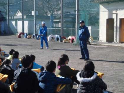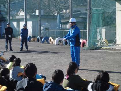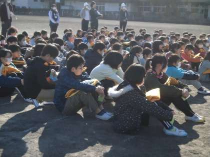 4〜6年生は、ベランダに出て西外階段を降りて、学校西側道路から運動場へ