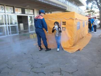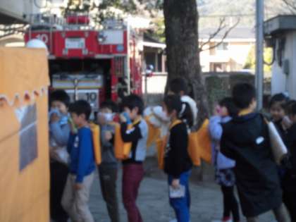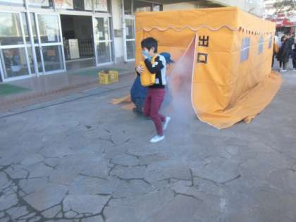 1,3,6年生が児童玄関前でスモーク体験を行います。
