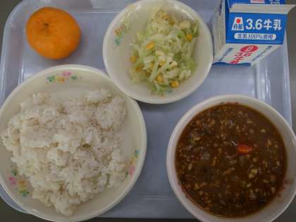 麦ご飯 牛乳 ビーンズカレー カリフラワーのサラダ 果物(ポンカン)