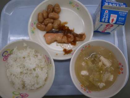 ご飯 牛乳 鮭の南蛮漬け 白花豆の甘煮 きゃべつの味噌汁