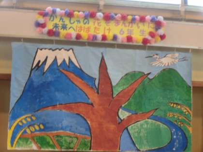 体育館のステージには、スローガン「感謝の花を満開に、未来へはばたけ6年生」と枯れ木の絵です。