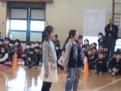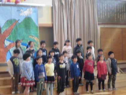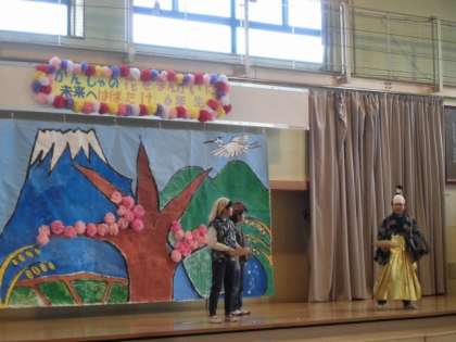 花咲かじいさんが、「枯れ木に花を咲かせましょう」と灰をまきます。
