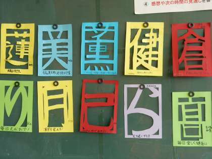 6年1組では、算数の「対称」の勉強をしていました。線対称の条件に合った自分が考えた図形を作りました。6年2組では、図工の時間に自分の名前の一文字をデザインしてカッターで切りぬき、自分のめあてをかきました。どちらも、なかなかの力作です。