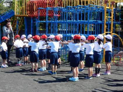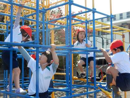 1年生が体育の時間に、並び方や遊具の使い方について勉強していました。ジャングルジムのところでは、担任の先生が、のぼって、黄色のバーを触って降りてくるように言いました。みんな一斉にのぼろうとした時、だれかが「きょうそうじゃないんだよ。」と言いました。その一言で、みんな先を争ってではなく、自分のペースで、周りの友達を見ながらのぼり始めました。すてきな瞬間でした。