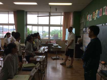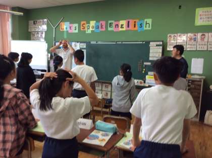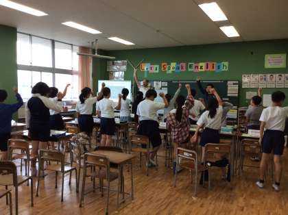 6年生の英語は,大平中の大川先生と,ALTのアーロン先生と一緒に授業を行っています。最初の挨拶から元気いっぱいです。