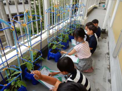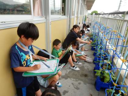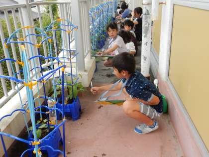 1年生が育てているあさがおは、ぐんぐん育ち、支柱につるをまきはじめました。みんな、つるの巻き方やさわった感じを確かめながら、かんさつカードに自分のあさがおの様子をかきました。