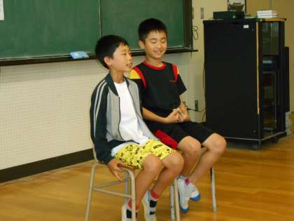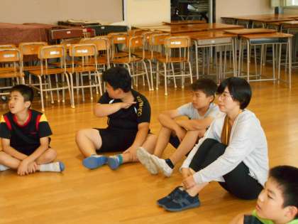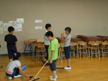 音楽室のいすや机を片付けて広くすると、ほこりがたくさん出てきました。みんな進んで掃除を始めました。