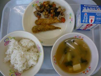 今日は蒸し暑い日なので少し食欲が落ちている子がいました。魚と豆の和食給食が苦手な子もいましたが、1年生の教室で「煮豆を食べると筋肉が付いて足が速くなるよ〜」と言うとおかわりの手がたくさん挙がり、五目煮豆の食缶が一気に空っぽになりました。