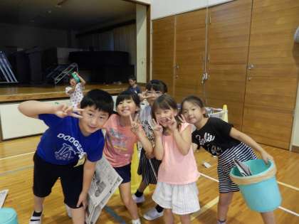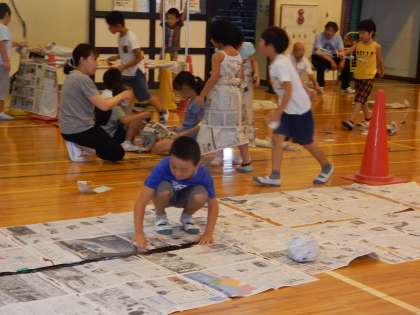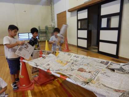 1年生が図工の時間、新聞紙を使った造形あそびを体育館で行いました。