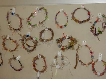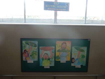 掲示板に4年生がかいた「大きなゴーヤをとったよ。」の絵が掲示されました。ゴーヤをしっかり見てかいたのがよくわかります。色鮮やかな画面もとてもきれいです。2年生は、黒い画用紙にはさみで思い思いに切った形をはりあわせて「はさみ ああと」の作品をつくりました。一人一人の思いが画用紙に込められています。1年生は、1学期お世話をしてきたあさがおのつるを使って、きれいなリースを作りました。飾ってあるものがみんな違っていてすてきです。