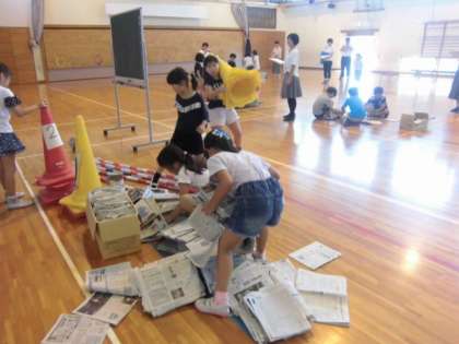 子どもたちは、たくさんの新聞紙を目の前にして。自分たちの新聞紙ワールドづくりにわくわくしています♪