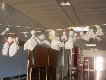 明日に迫った6年生の修学旅行。天気に恵まれるように児童玄関には、大きなてるてる坊主が登場しました。そして、6年生の教室の前には、6年生の思いを込めた一人一人のてるてる坊主がつるしてあります。ずっと下調べをしたり、朝から体力をつけて班別行動ができるように運動場を走ったりしてきた6年生です。明日が、最高のお天気になりますように、願っています。