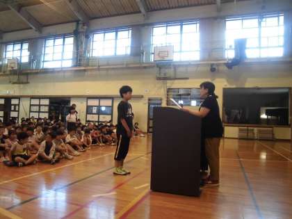 今月は、各学年リレー大会があります。競い合い、応援し合い、みんなぐんぐん伸びていけたらいいなと思います。その後、後期の学級役員、委員会委員長等の任命と文園、読書感想文の表彰を行いました。