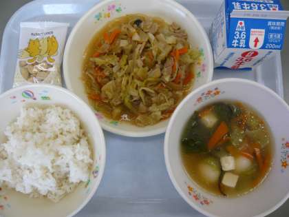 今日は朝鮮料理のプルコギです。しょうゆやみそで味付けしたプルコギでみんなよくごはんが進んでいました。上にかけてプルコギ丼にしている子も多くいました。