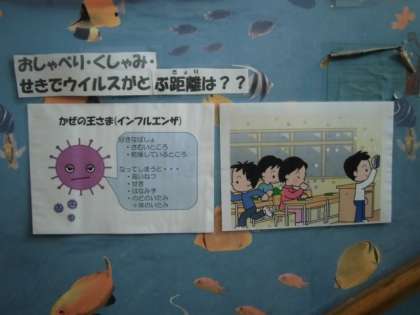 階段に、「かぜやインフルエンザを予防するには・・・」が掲示されています。