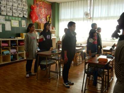 6年1組の教室では、儀式の時の姿勢について、みんなで体感していました。卒業式に向けて、動かず、堂々と式に臨むためには、どんな姿勢をどんなふうに作っていくのか確かめました。