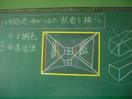 3学期の図工では、思い出の校舎を遠近感を出すことを目当てに描き始めました。まずは、対象物をよく見て、描くところから練習しました。「縦の高さから決めると、描きやすそう。」とこつをつかんだようです。