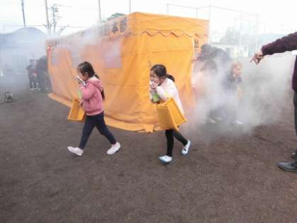 ハンカチで顔を顔を覆い、壁に触って進み、出口まで行きます。