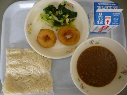 メインは子供たちの好きなソフト麺、しかもカレーソースなのでもりもり食べていました。イカリングフライはイカの好き嫌いが分かれ、しかも低学年では噛み切れないという子もいて、3年生までは1つだけでしたが残念ながら残りがちでした。とてもおいしかったのですが...