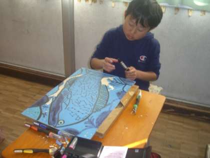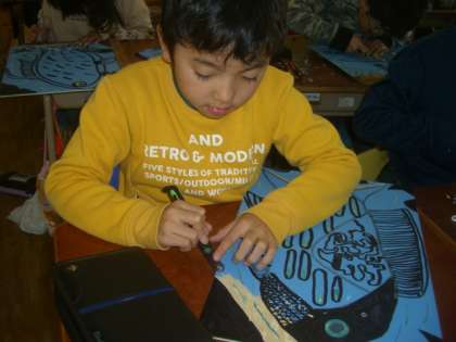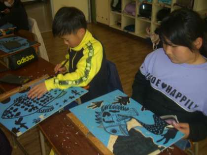 5・6時間目の図工では、初めての木版画で彫刻刀を使い始めました。持ち方や注意することをはじめに確認してから、海の部分から掘り始めました。ミノカサゴのひれ、キンギョハナダイのうろこ、カエルアンコウの模様など彫刻刀の彫り味を確かめながら彫りました。
