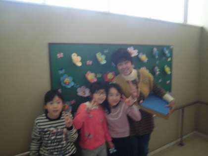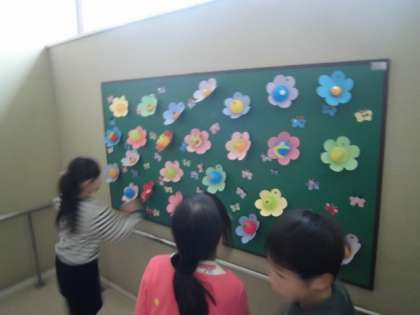 赤階段、踊り場に、2年生が卒業生へ「卒業おめでとう」のかわいらしい飾りを作ってくれています♪