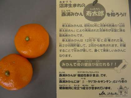 今日の大平小の寿太郎みかんはJAなんすんさんから無償で提供していただきました。一緒にいただいたチラシにも書かれていますが、とても甘く濃くておいしいみかんで、沼津市が全国に誇る特産物です。すっぱいみかんより、寿太郎みかんのように甘いみかんの方が「βクリプトキサンチン」が豊富に含まれているそうです。(チラシは全員に配りましたので読んでみてください)