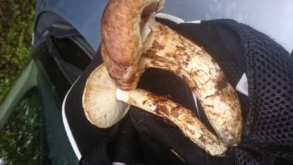 さて、皆さんお元気ですか?今日は服部先生からキノコクイズです。下の三つのしゃしんの中に、せかいさいだいのせいぶつといわれるキノコがあります。一番上は?、そうマツタケですね。これは、日本一ねだんの高いキノコです。一番下の白いキノコはドクツルタケ、もうどくのキノコです。絶対にとってはいけません。では、真ん中のキノコは?オニナラタケです。大きく見えないって?そうですね、皆さんがキノコとして食べてるのは、子じったいといわれるキノコでは花にあたるぶぶんです。キノコのほとんどは、土の下。そう、そのつちのしたのぶぶんが、山一面をおおうくらい大きいのです。だから、2番目のオニナラタケがせいかい。たまには、キノコのずかんでも見てみじかなキノコをしらべてみてはいかがかな?