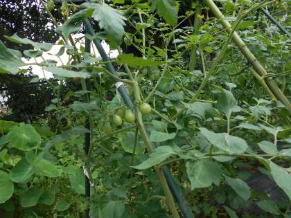1時間目、雨の降り出す前に野菜畑の草取りをしました。ミニトマト(ジュエル)の実がかわいらしくついているのを見つけて大歓声!赤くなるのが楽しみです。大きなオクラの葉っぱに驚いていました。マルチの間の通路の草を3つの袋がいっぱいになるまで取りました。