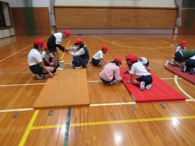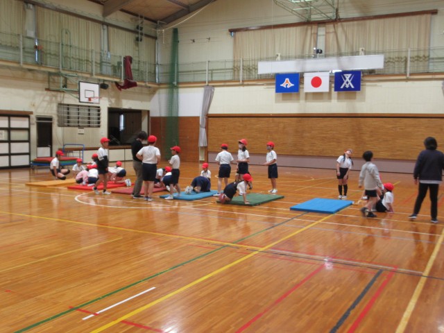 マット運動を行っています。マットからの距離を確認しています。