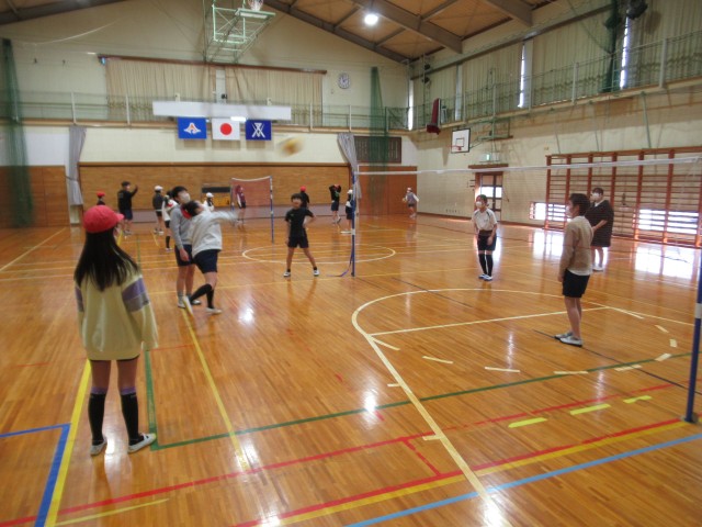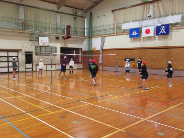 4チームに分かれ、バレーボールを行っています。