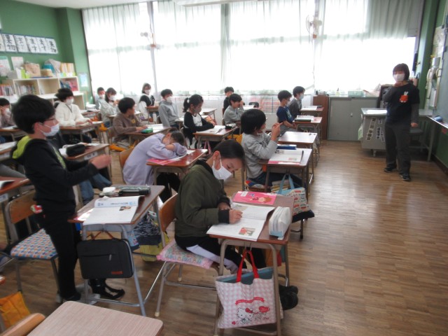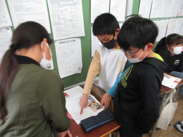 資料「雨のバス停留所で」を読み、主人公のとった行為やお母さんの無言の訴えについて考えています。