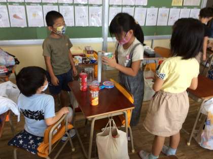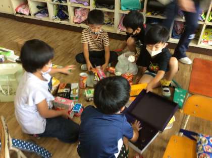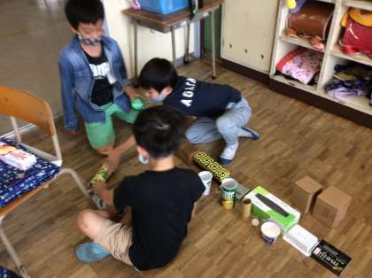 1年生は算数で「かたち」について学習しています。自分たちが集めたお菓子や薬の箱を、自分たちの考えた種類で仲間分けしました。「これはどっちの仲間かな?」「すごく大きいけど、こっちの仲間だね。」などとグループで相談しながら分けました。
