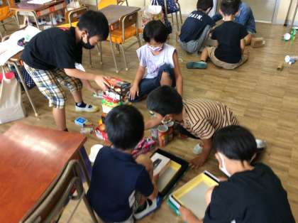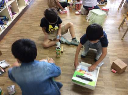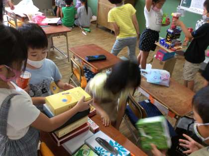 箱の形の学習の一環で、箱積み競争をしました。グループ毎、少しでも高く積もうと必死です。