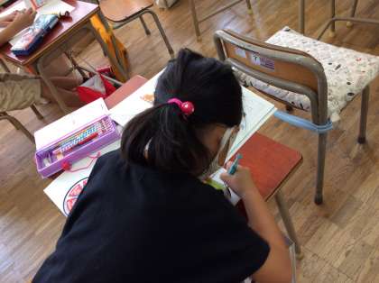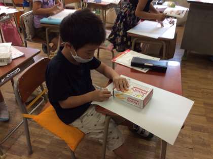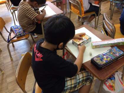 箱の形を紙に型どり、形を組み合わせて絵をかきました。