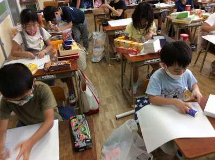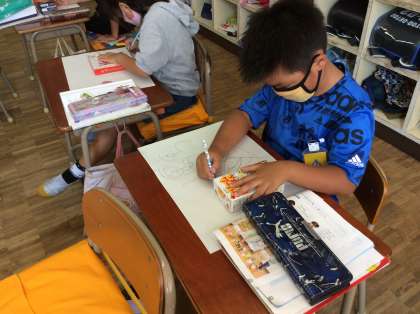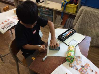 丸、三角、四角など色々な形を組み合わせて、楽しそうな絵をかいていました。