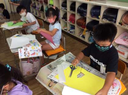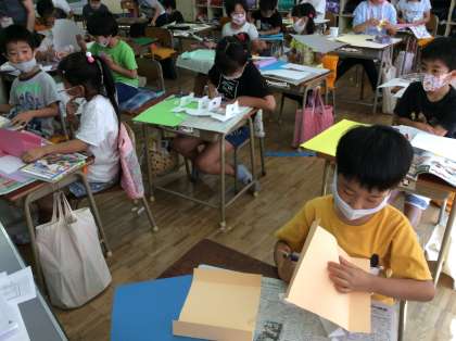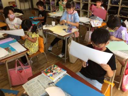 1年生は図工で「おってたてたら」の作品をつくりました。画用紙を折って立てて、立体的な作品を作りました。