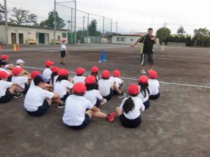 前時の「動きながらバトンタッチをする」を受け、今日は、「上手にバトンタッチをする」が目標になります。