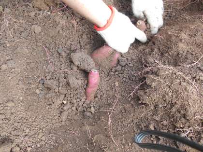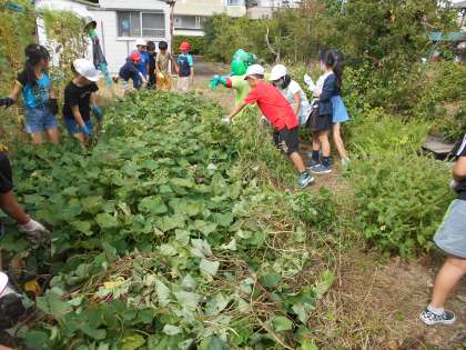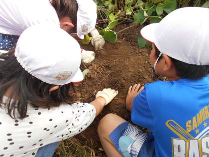 5時間目の総合では、サツマイモ(ベニアズマ)の試し堀りをしました。つる返しをしてからみんなで交代で掘ります。夢中になっているうちに玉の汗が落ちてきます。力を合わせて大小様々なお芋を収穫しました。あと、10日ほどおいてから全部掘りたいと思っています。カエルマンと首長星人が見守ってくれています!