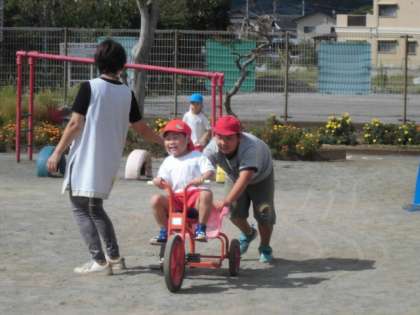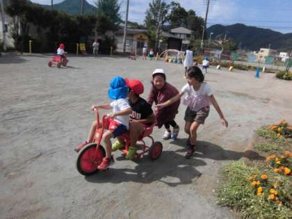 三輪車に園児を乗せて、押します♫