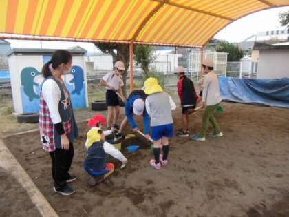 5年生がスコップで砂を掘ると大きな山が簡単にできるよ♩