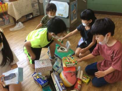 1年生は算数で「かたち」の学習を行いました。平らな面がある、転がりやすい面がある、など、形に注目して仲間分けをしました。