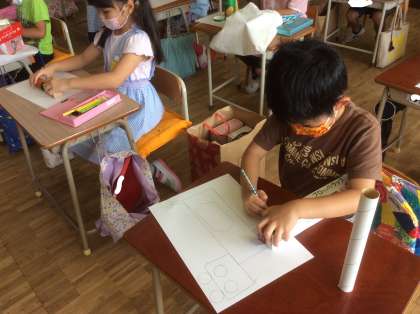 箱の面の形に着目して、紙に写し取って絵を描きました。ロボット、家、動物など想像力を働かせて、いろいろな絵を描いていました。