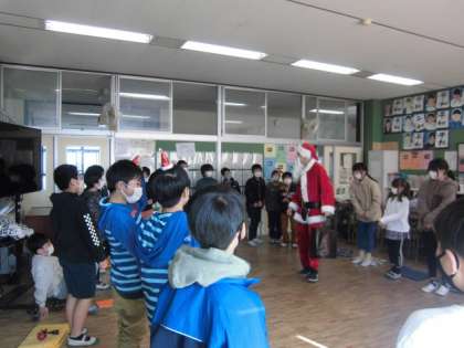 2学期の終わり、各クラスで子供たちの企画したいろいろな会が行われました。3階から「♫ あわてんぼうの〜サンタクロース…♪」の歌声が聞こえてきました。教室をのぞこうと思ったら、サンタさんとばったり。「子供たちが今まで頑張ったから、本格的にサンタになりたくなって。」と担任。一人一人が心を込めたクリスマスカードは英語をつかったものもありました。