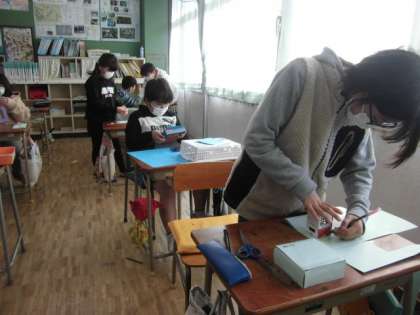 今日の4年生の算数の授業は、直方体の展開図の学習です。持参した箱の面を書き取り、色画用紙を切ってつなぎます。真剣な表情の4年生です。